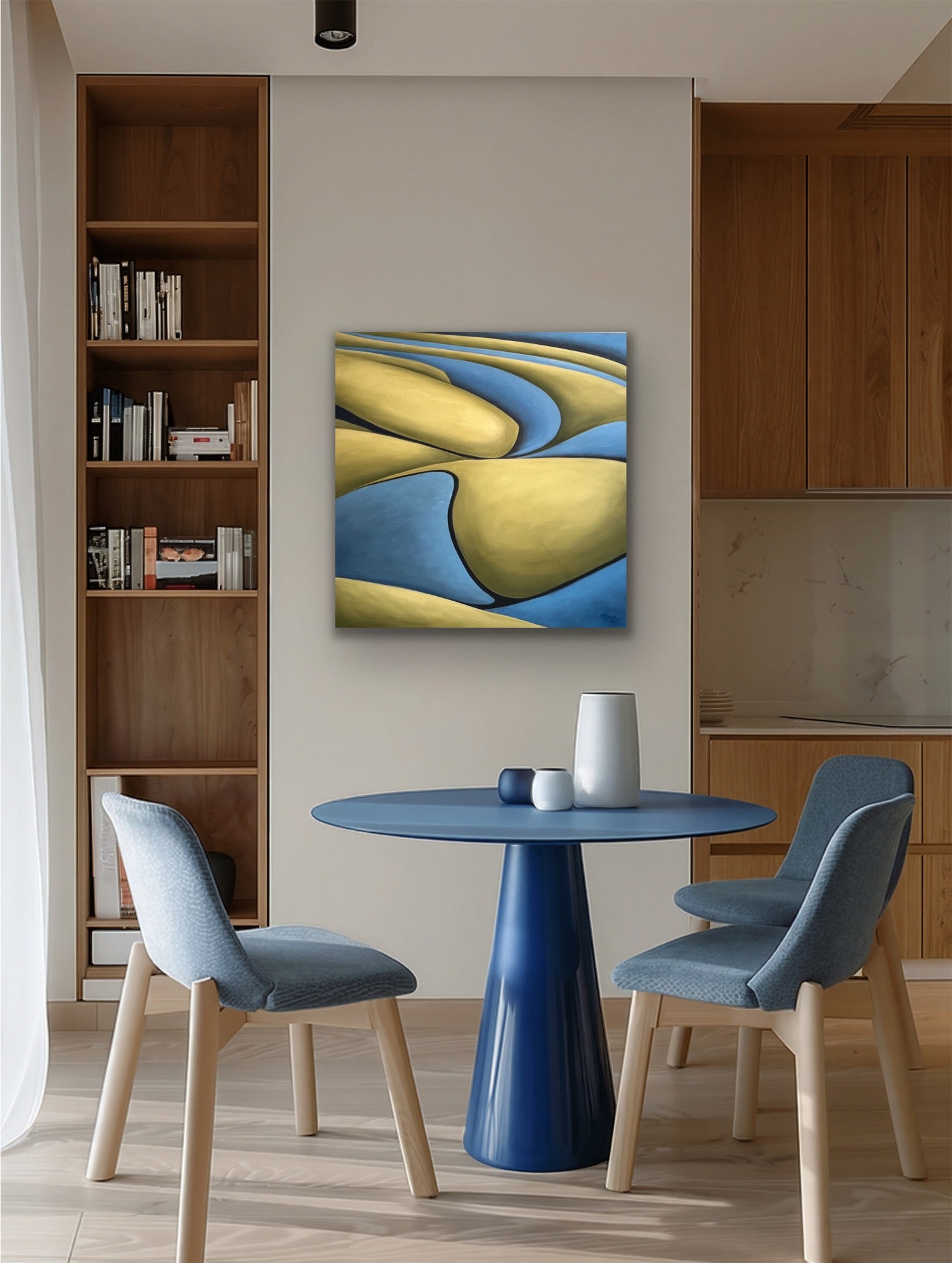 In this abstract depiction, the blues and greens of the hills create a rhythm, symbolizing life's ups and downs. As the eye moves across the canvas, it is drawn from one hill to the next reminding us of our ability to harmonize with life's ever-changing flow.